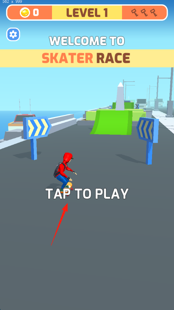 1、開局引導“LEVEL1”點擊“TAPTOPLAY”開始,控制紅衣滑板角色,在沿海賽道滑行。