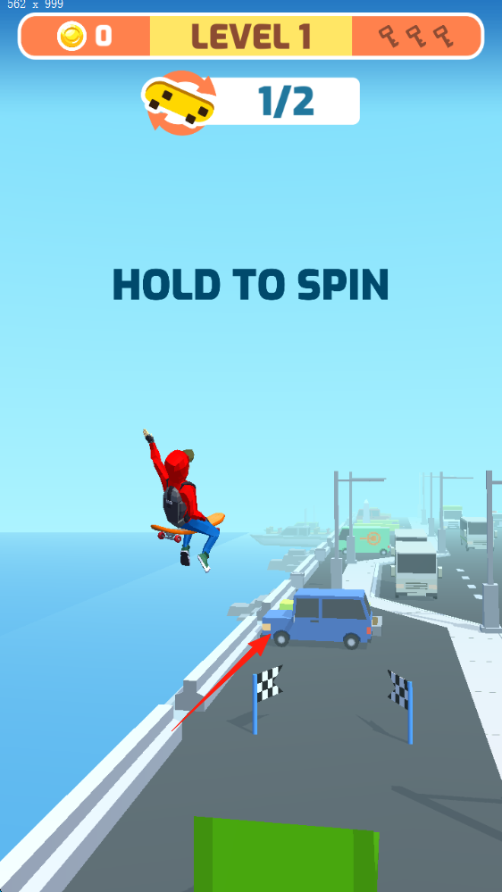 2、特技操作遇坡道,長按“HOLDTOSPIN”觸發(fā)翻轉特技,完成“1/2”旋轉目標,避開車輛(藍色面包車)。