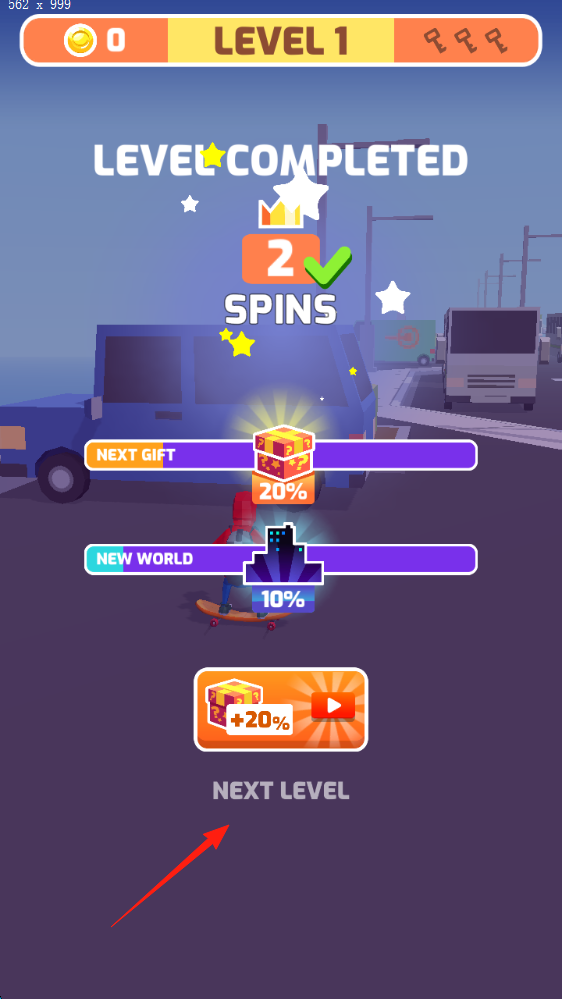 3、關卡結算完成“LEVEL1”得2次旋轉(SPINS),進度條顯示“NEXTGIFT(20%)”“NEWWORLD(10%)”,點“NEXTLEVEL”進下一關。