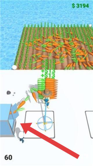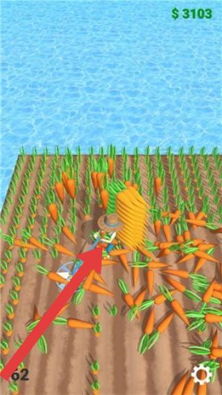 2、呈現農田場景,有角色、胡蘿卜作物、收割工具,上方顯示金錢$3103,是農場收割玩法,玩家操控角色收割作物,屬于模擬農場經營、側重收割操作的內容。