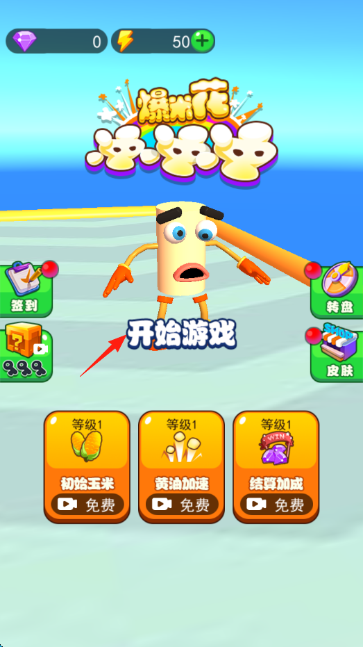 1、開局準備點擊“開始游戲”,選擇“初始玉米”等增益(看廣告激活),消耗鉆石(0)、體力(50)進入關卡。