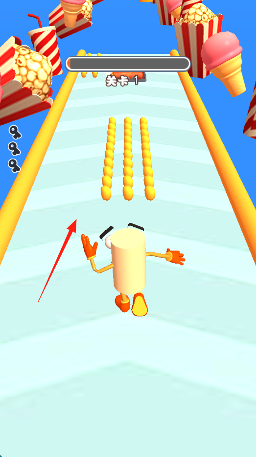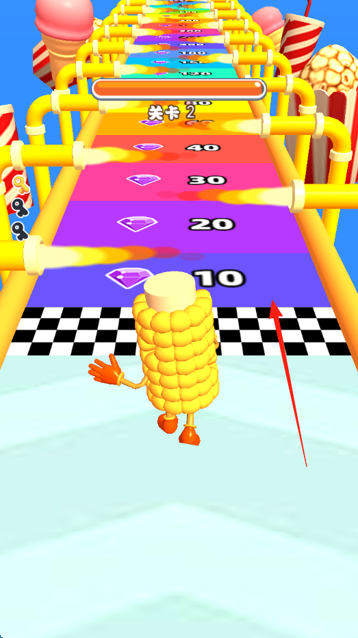 2、收集成長操控玉米角色,沿跑道收集黃色玉米粒(關卡1)、彩色鉆石(關卡2),讓角色體積變大、升級。