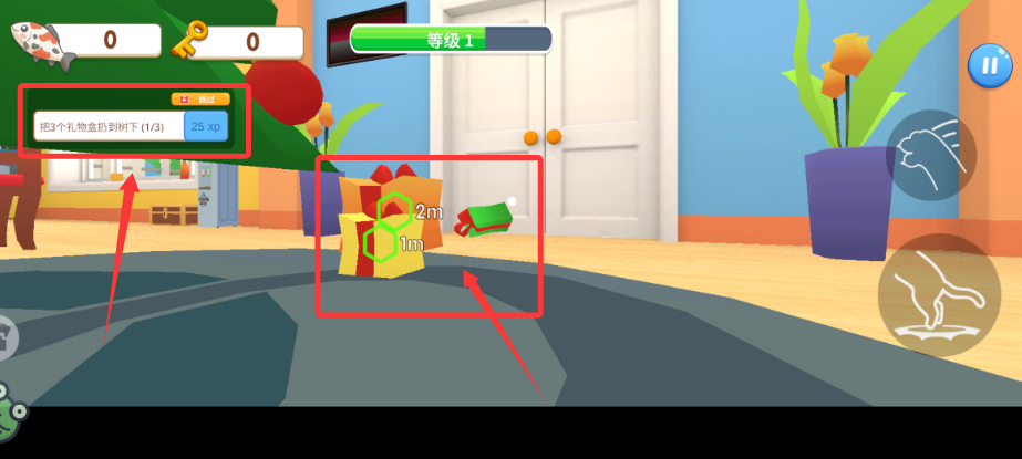 2、進(jìn)入關(guān)卡,依據(jù)左上角任務(wù)提示,操控角色把對(duì)應(yīng)數(shù)量禮物盒扔到指定區(qū)域。