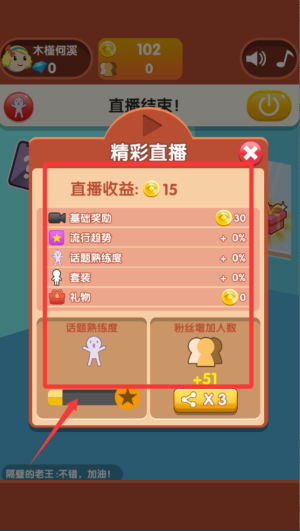 3、拿到獎(jiǎng)勵(lì)后優(yōu)先升級(jí)角色基礎(chǔ)屬性和技能等級(jí),增強(qiáng)直播表現(xiàn)力。