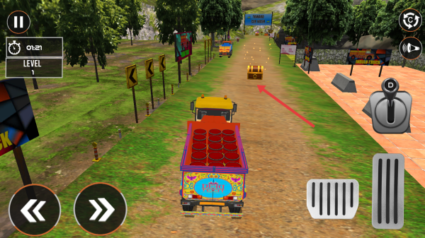 2、駕駛裝飾卡車,沿土路行駛,用虛擬按鍵控制方向、油門,避障前行。