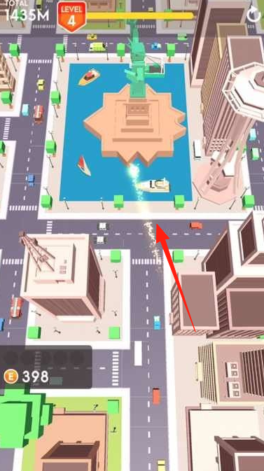 2、跑酷機制擊球后,球在城市場景(街道、地標建筑)飛行,需避開車輛、建筑,飛行越遠得分越高,界面顯示距離(1435M)。