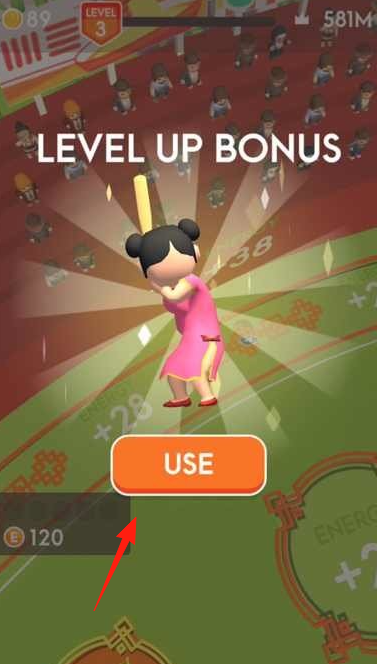 3、升級獎勵完成關卡后,觸發(fā)“LEVELUPBONUS”,點擊“USE”領取獎勵(金幣、能量),解鎖新角色、技能,提升實力。