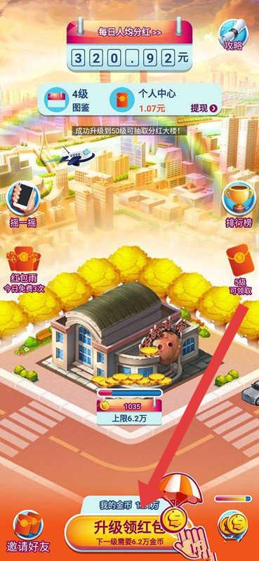 2、在主界面,點(diǎn)擊【升級(jí)領(lǐng)紅包】(紅箭頭指向),消耗金幣升級(jí)建筑,獲取紅包獎(jiǎng)勵(lì)。
