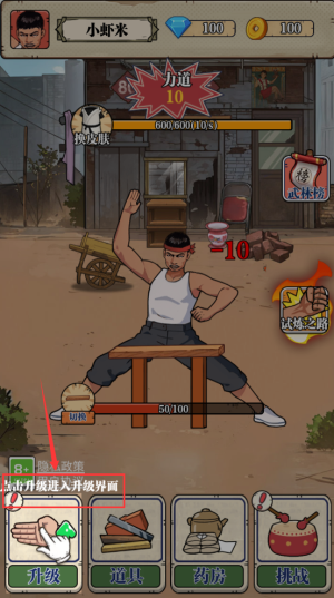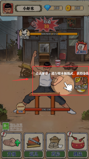 2、點(diǎn)擊屏幕劈木板,提升力道賺取金幣獎勵。