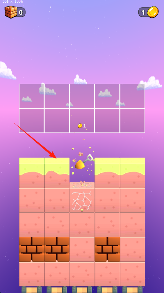 3、鏟子掉落下方后,自動(dòng)破除方塊,持續(xù)操作,挖掘更多區(qū)域。