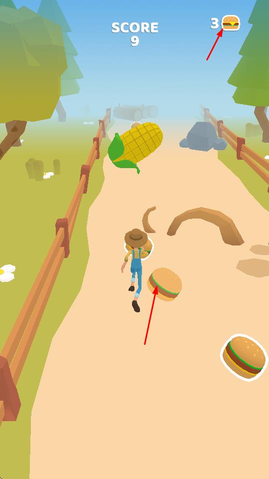 2、在跑酷過程中,通過左右滑動(dòng)屏幕控制角色移動(dòng)方向,躲避前方和兩側(cè)出現(xiàn)的暴躁蔬菜,同時(shí)點(diǎn)擊屏幕拾取漢堡道具。