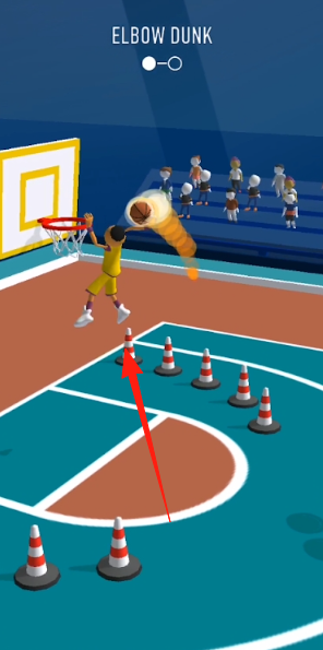 1、扣籃挑戰(zhàn)在球場(chǎng),控制黃衣球員,避開(kāi)障礙(錐桶、防守者),收集金幣,完成“ELBOWDUNK”“UNDERBASKETDUNK”等特技扣籃。