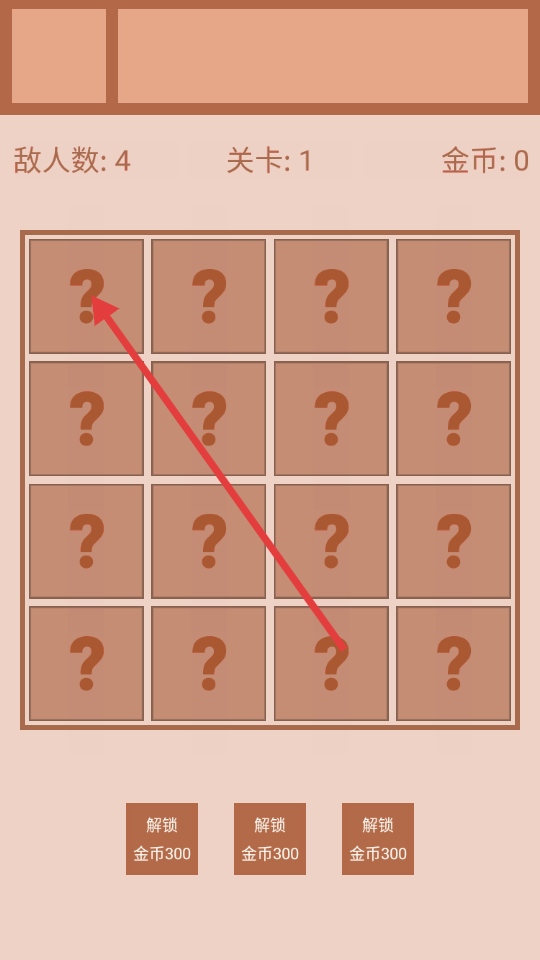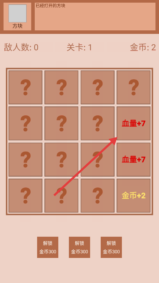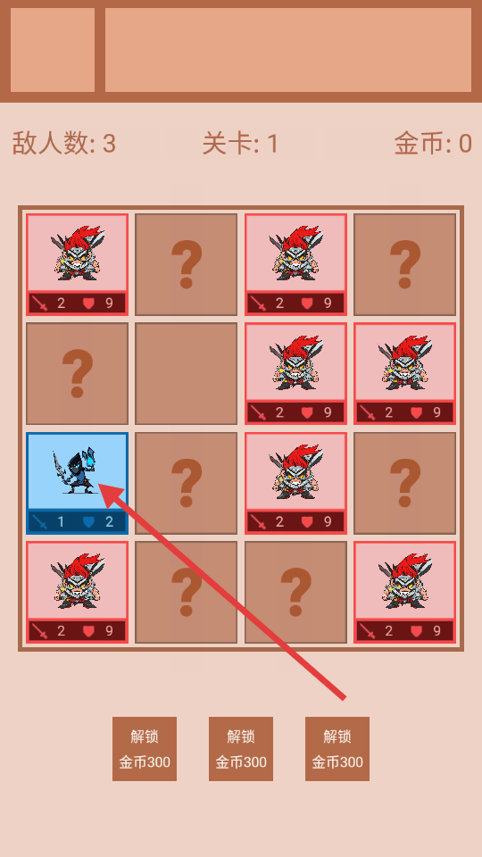 1、點擊問號格子隨機翻牌,紅色英雄加入隊伍藍色怪物觸發(fā)戰(zhàn)斗。