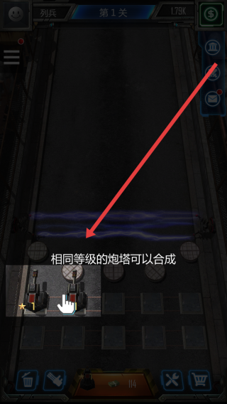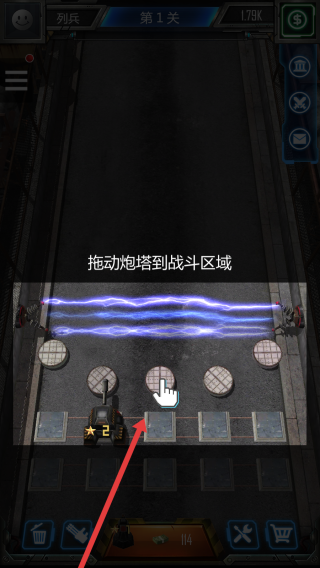 3、戰(zhàn)斗時,拖動合成后的炮塔到戰(zhàn)斗區(qū)域(箭頭指向位置),布置防御,攔截敵人,推進關(guān)卡。