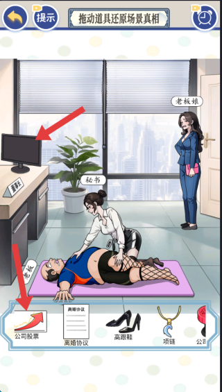 2、還原真相:拖動(dòng)道具(如“公司股票”“離婚協(xié)議”)到對(duì)應(yīng)位置(電腦、人物),揭露事件。