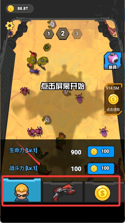 2、開(kāi)始游戲前可以點(diǎn)擊下方按鍵升級(jí)自己的戰(zhàn)斗力。