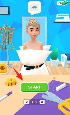 1、玩法機(jī)制扮演設(shè)計(jì)師,點(diǎn)擊“START”為顧客量體,選擇服裝樣式(如連衣裙)、圖案顏色,通過縫紉機(jī)縫制衣物,完成訂單。