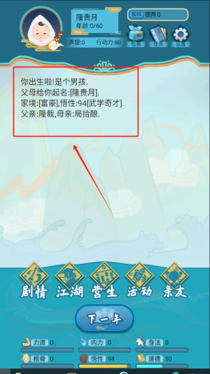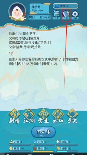4、靈活自由的年限選擇,玩家能自主決定何時(shí)闖蕩江湖,拜師學(xué)藝,增添了游戲的沉浸感和自由度。
