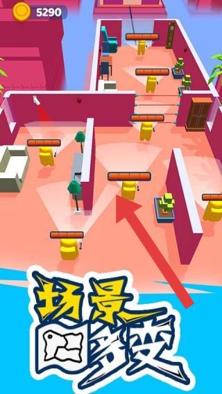 3、從下方文字“場景多變”游戲主打場景多樣化玩法,畫面中有不同顏色的角色和場景布置,還顯示了金幣數(shù)量5290。