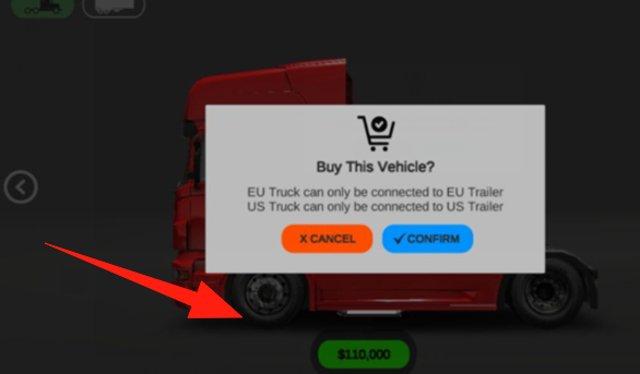 3、決定購(gòu)買車輛時(shí),確認(rèn)EUTruck等信息后,點(diǎn)【箭頭】下方“CONFIRM”,花費(fèi)$110,000購(gòu)入。