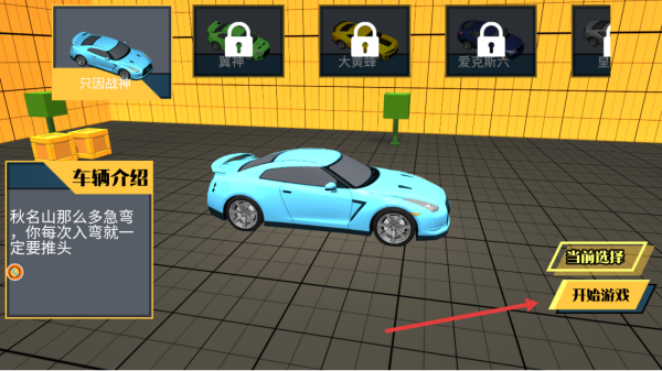 2、從首圖點(diǎn)“開始游戲”,在車庫(kù)選可用車,看介紹后點(diǎn)“開始游戲”進(jìn)入賽道駕駛。