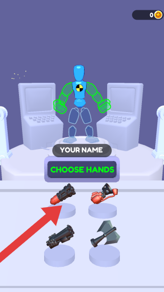 1、這是一款的角色裝備選擇界面,藍色角色形象下方文字“CHOOSEHANDS”意為“選擇手部裝備”,下方提供了幾種不同的手部武器供玩家選擇。