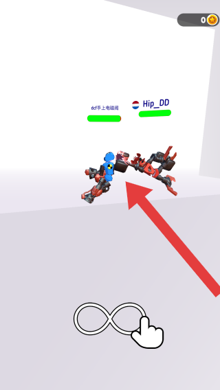2、顯示了兩個玩家操控的機器人角色,分別是“M仔上電腦課”和“Hip_DD”,界面有血量條等信息,下方有操作指引圖標。