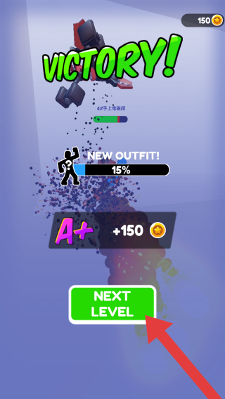 3、顯示“VICTORY!”(勝利),角色名“M仔上電腦課”,獲得新外觀(NEWOUTFIT!進度15%)、A+評級和150金幣獎勵,有“NEXTLEVEL”(進入下一關)按鈕。