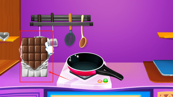 3、點(diǎn)爐灶開關(guān)開始做蛋糕,用旁邊勺子攪拌,巧克力是重要食材別浪費(fèi)。