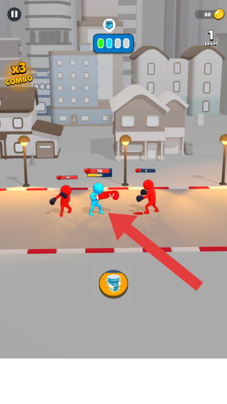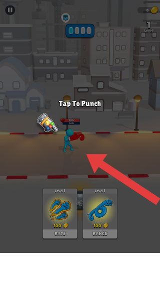 1、屬于動作格斗類,畫面呈現的是城市街道戰(zhàn)斗場景,有藍色拳擊角色、敵方目標,文字“TapToPunch”是玩法提示(點擊出拳)。