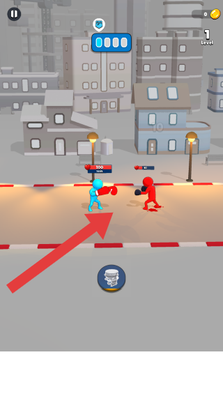 2、畫面中藍色角色和紅色角色正在城市街道場景中進行拳擊對戰(zhàn),左上角有暫停按鈕,右上角顯示關卡為1級,還有金幣數量,藍色角色上方有血量條顯示為100。