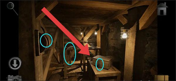 2、場(chǎng)景中,點(diǎn)擊箭頭指向的交互點(diǎn)(藍(lán)色圈定區(qū)域),搜索道具、線索,用于后續(xù)解謎,探索密室環(huán)境。