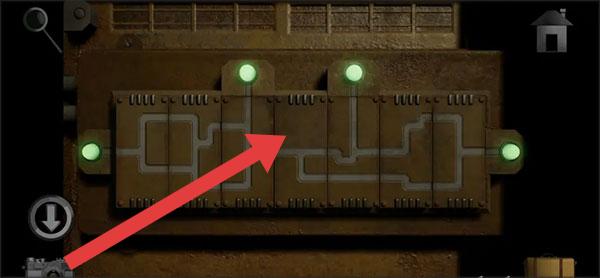 1、電路解謎界面,按箭頭指向路徑,連通電路(綠色光點(diǎn)),解開機(jī)關(guān),推進(jìn)游戲進(jìn)程。