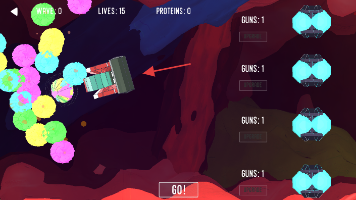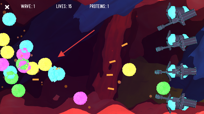 3、戰(zhàn)斗時(shí),操控右側(cè)防御塔,攻擊箭頭指向的彩色球體敵人,守護(hù)陣地。