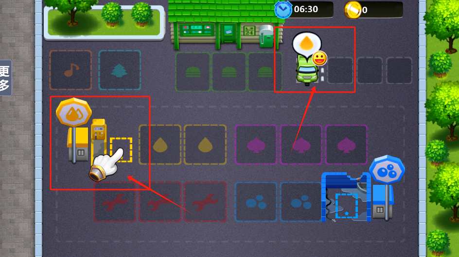 3、點(diǎn)黃色加油機(jī)給車加油,藍(lán)色維修區(qū)可進(jìn)行修車操作,當(dāng)車位停滿車輛并完成服務(wù)后就能賺取收益,積累資金用于店鋪發(fā)展。