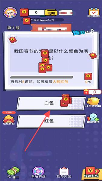1、看到題目“我國春節(jié)的對聯(lián)是以什么顏色為底?”,點(diǎn)擊【紅色】選項(xiàng),這是正確答案。