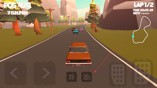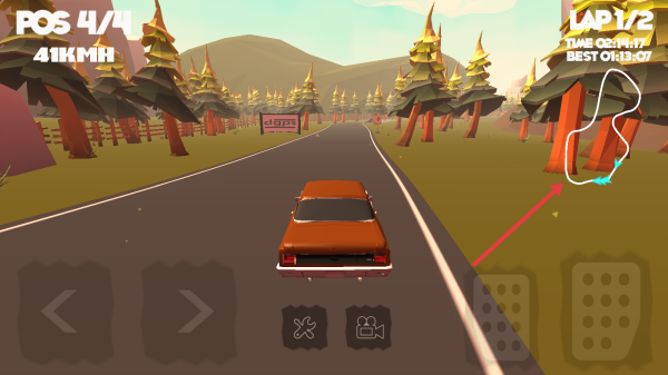 2、比賽中,操控橙色賽車在山道行駛,畫面顯示當(dāng)前排名(POS4/4)、圈數(shù)(LAP1/2)等信息,點(diǎn)擊下方扳手圖標(biāo)可維修賽車,攝像機(jī)圖標(biāo)能記錄精彩瞬間。
