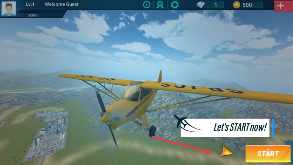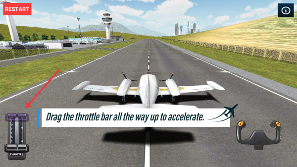 1、在初始界面,點(diǎn)擊黃色“START”按鈕,進(jìn)入飛行準(zhǔn)備,操控白色飛機(jī),學(xué)習(xí)油門拉桿加速操作。