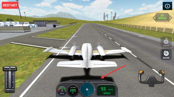 2、拖動左側(cè)油門桿(THROTTLE)至頂端,讓飛機(jī)在跑道加速,留意速度表(55km/h起),準(zhǔn)備起飛。
