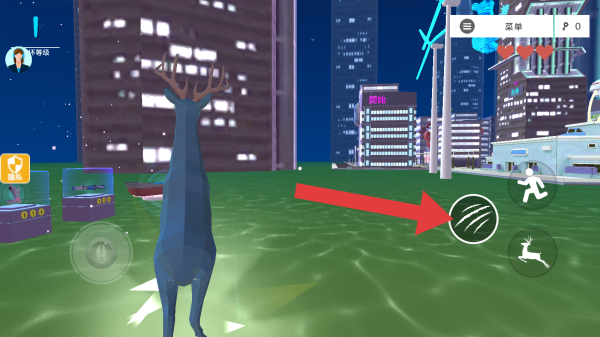 3、玩家操控鹿形角色,畫面中紅色箭頭所指圖標(biāo)可能是攻擊按鈕,此外還有移動(dòng)、奔跑等操作按鈕,右上角有“菜單”選項(xiàng)和得分顯示(P0),背景是城市夜景。