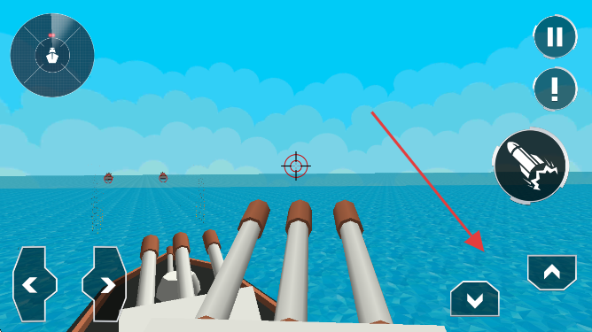 3、操作右側(cè)向下箭頭按鈕,控制戰(zhàn)艦減速或下沉,配合攻擊,精準(zhǔn)打擊敵人。