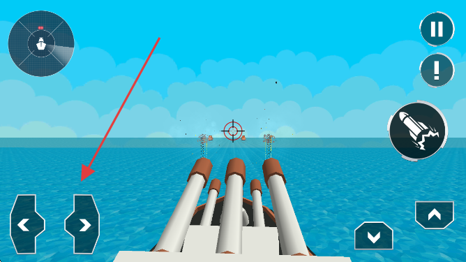 2、戰(zhàn)斗時,點(diǎn)擊左側(cè)箭頭按鍵,操控戰(zhàn)艦轉(zhuǎn)向,對準(zhǔn)目標(biāo)調(diào)整射擊角度。