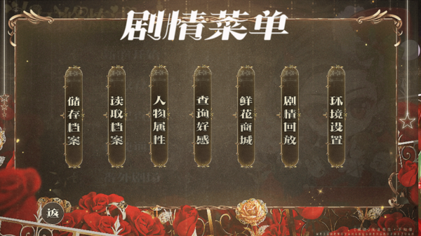 3、菜單頁可【儲(chǔ)存檔案】【讀取檔案】,查【人物屬性】【查詢好感】,逛【鮮花商城】,【劇情回放】重溫,調(diào)【環(huán)境設(shè)置】推進(jìn)游戲。