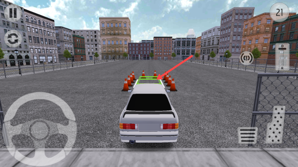 2、在停車場場景,操控車輛,用虛擬方向盤、按鍵,沿路線行駛,避開橙色路錐,瞄準(zhǔn)綠色框位。