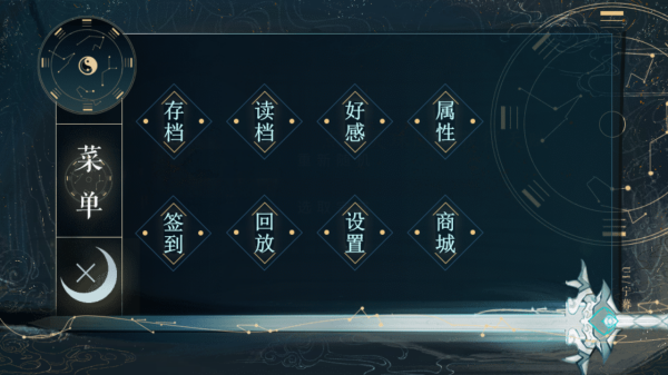 3、菜單頁可【存檔】【讀檔】,查【好感】【屬性】,參與【簽到】,【回放】劇情,調(diào)【設(shè)置】,逛【商城】推進游戲進程。