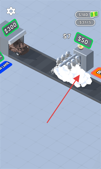2、隨著游戲推進(jìn),看到標(biāo)有收益倍數(shù)(如$140X)和金額(如$10、$12)的區(qū)域,點(diǎn)擊升級(jí)設(shè)備,增加清洗車道,提高清洗效率,獲取更多收益。