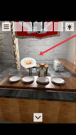 1、點擊柴犬身旁懸浮的金色物品,收集該關(guān)鍵道具,同時留意桌上空盤與背景裝飾,為后續(xù)互動積累線索。