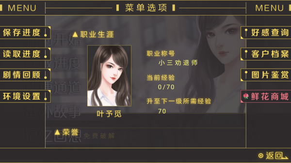 3、菜單頁可【保存進(jìn)度】【讀取進(jìn)度】【劇情回顧】,調(diào)【環(huán)境設(shè)置】,查【好感查詢】【客戶檔案】,逛【鮮花商城】,借功能推進(jìn)游戲進(jìn)程,關(guān)注角色“葉予覓”職業(yè)生涯成長。