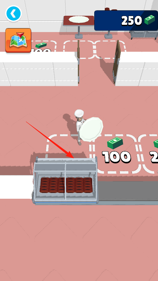 2、進入經(jīng)營環(huán)節(jié),引導(dǎo)廚師走向食材柜,準(zhǔn)備采購,借移動機制,讓角色靠近標(biāo)有“100”的食材區(qū)域,為餐廳儲備原料,感受資源收集的基礎(chǔ)操作,推進經(jīng)營流程。