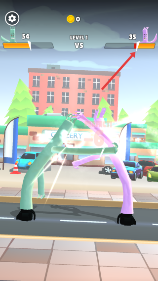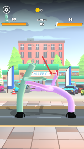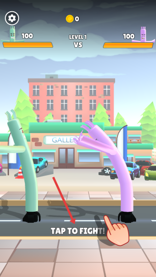 1、在LEVEL1界面,點(diǎn)擊“TAP TO FIGHT!”提示區(qū)域,操控綠色充氣角色向紫色對(duì)手發(fā)起攻擊。